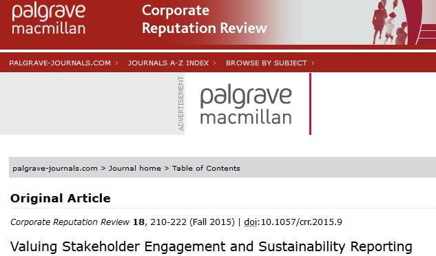Excerpt from: Camilleri, M.A. (2015) “Valuing Stakeholder Engagement and Sustainability Reporting”. Corporate Reputation Review, Vol. 18 (3) pp210-222. DOI:10.1057/crr.2015.9 http://www.palgrave-journals.com/crr/journal/v18/n3/full/crr20159a.html