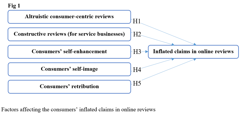 Figure 1. presents an illustration of the five (5) research hypotheses. In sum, it presumes that the consumers’ self enhancement and/or self-image as well as their motivations to share altruistic reviews and/or constructive evaluations, as well as their emotionally driven retribution toward service providers are significant antecedents of their inflated claims in online reviews.